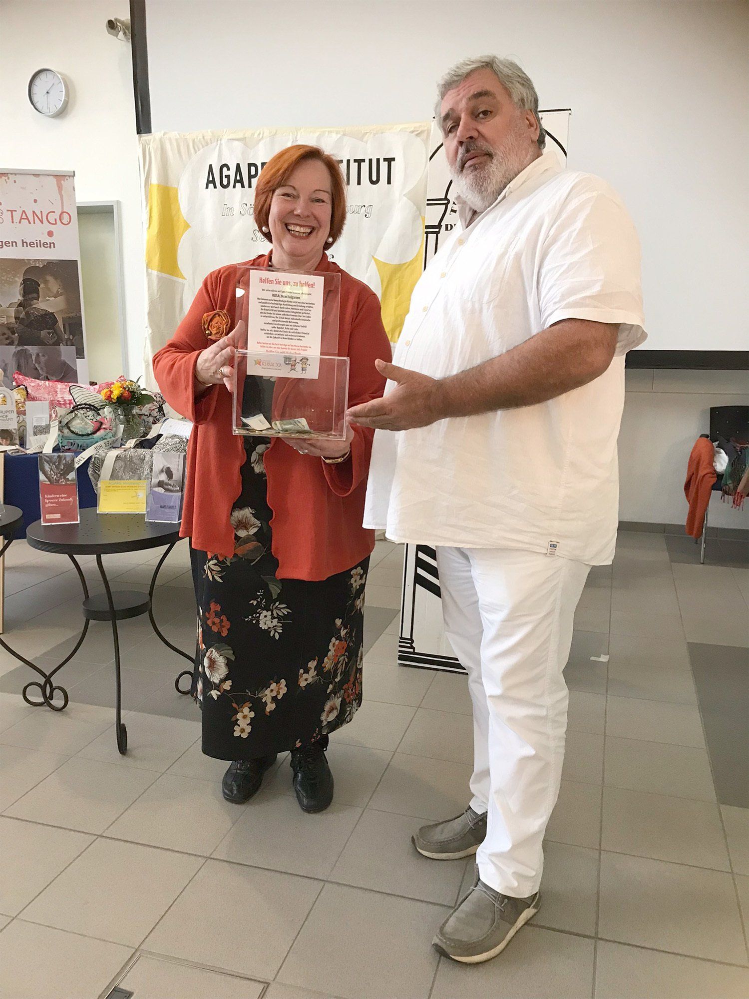 Das hörte auch die Unternehmerin Claudia Kohlhoff aus Oldenburg i.H., die neben Ihrer Reiki-Praxis „Reiki-Ostholstein“ auch die Veranstalterin des Musikabends „Tango trifft Orient“ ist und zudem die Gesundheitsmesse-Ostholstein ins Leben rief, die am vergangenen Wochenende zum ersten Mal stattfand. Auf beiden Veranstaltungen wurde ein wenig die Werbetrommel gerührt, außerdem wurden sogar die Getränke am Konzertabend oder die Fachvorträge auf der Messe kostenlos angeboten, und dafür um eine kleine Spende für das Schulprojekt gebeten. So kam ein Scheck über 100,- Euro zusammen, den Claudia Kohlhoff stolz Herrn Dr. Mintcho Kolev, dem Leiter des Schulprojektes Rusalya „Bildung statt Betteln“, zum Ende der Gesundheitsmesse-Ostholstein am Sonntagabend überreichen konnte.